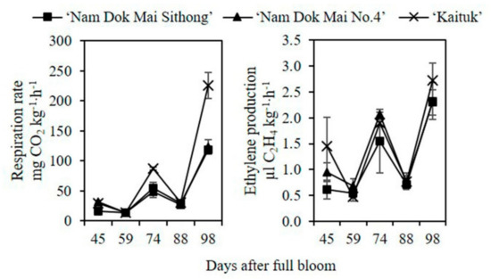 Changes in respiration rate and ethylene production of mango fruit cv. ‘Nam Dok Mai Sithong’, ‘Nam Dok Mai No. 4′ and ‘Kaituk’ during fruit development (45–88 days) and full ripening stage (98 days). The vertical bars represent the means with SE for three replications.