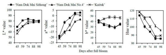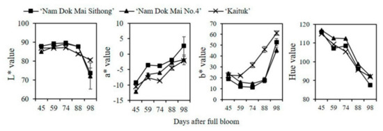 L*, a*, b*, and hue values in peel of mango fruit cv. ‘Nam Dok Mai Sithong’, ‘Nam Dok Mai No. 4′ and ‘Kaituk’ during fruit development (45–88 days) and full ripening stage (98 days). The vertical bars represent the means with SE for three replications.