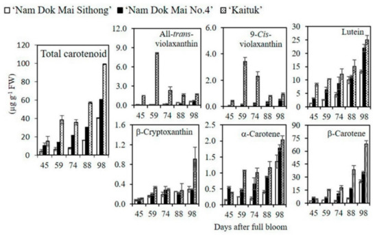 Changes in carotenoid content and compositions in peel of mango fruit cv. ‘Nam Dok Mai Sithong’, ‘Nam Dok Mai No. 4′ and ‘Kaituk’ during fruit development (45-88 days) and full ripening stage (98 days). The vertical bars represent the means with SE for three replications.