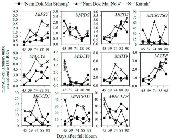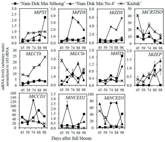 The expression of genes involved in carotenoid metabolism in pulp of mango fruit cv. ‘Nam Dok Mai Sithong’, ‘Nam Dok Mai No. 4′ and ‘Kaituk’ during fruit development (45–88 days) and full ripening stage (98 days). The vertical bars represent the means with SE for three replications.