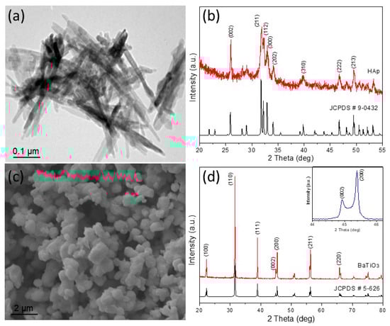 TEM image (a) and XRD pattern (b) of synthetic HAp crystals. SEM micrograph (c) and XRD diffractogram of BT crystals. The standard JCPDS files for HAp and BT are shown in Figures (b) and (d), respectively.