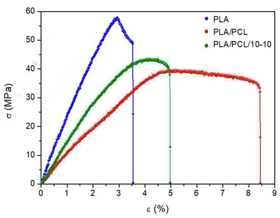 Stress–strain (%) curves for pure PLA, PLA/PCL, and PLA/PCL/10-10 filaments.