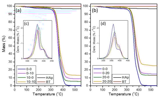 Thermogravimetric Analysis (TGA) is used to study the thermal stability of all preparations and to calculate the mass of fillers in composite filaments in comparison with the loaded amount. Figure 3 shows the TGA thermograms of all samples while the insert depicts the differential gravimetric analysis thermograms (DTGA) in the range from 250 to 450 °C which corresponds to the main thermal transition. The TGA graph of pure hydroxyapatite shows a continuous mass loss with a value of 3.1% at 550 °C. The mass loss is associated with absorbed water up to 200 °C, while at the range 200–400 °C it is due to the removal of lattice water. Mass loss in the range 200–550 °C is associated with the decomposition of hydrogen phosphate ions (HPO42−) into pyrophosphate ions (P2O74−) [37,38]. In contrast, the mass loss of pure BT at 550 °C is less than 0.2%.