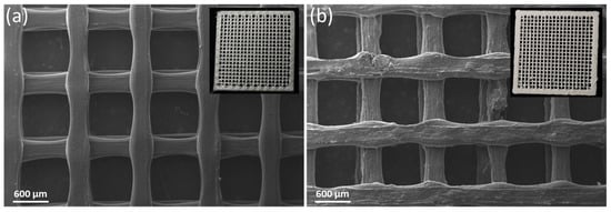 A regular array of square macropores is observed in both cases. The dimensions of the pores and the printed lines were measured from twenty SEM images using the image analysis program ImageJ. It was found that in the case of PLA/PCL objects, the mean pore size was 850.4 ± 48.5 μm while the mean diameter of the printed lines was measured at 393.3 ± 51.8 μm. Similar results were taken in the case of composite specimens. In the case of the PLA/PCL/10-10 objects, the values were 822.3 ± 19.6 μm and 397.2 ± 58.0 μm, respectively. The line width is close to the nozzle diameter which is 0.4 μm. However, the mean pore size is lower than the theoretical design in the 3D pattern, which is about 1.1 μm. This can be attributed to the deformation of the polymeric melt due to the low melting point of PCL. However, optimization of parameters such as flow rate and printing speed can lead to more precise printed pores in comparison with the designed 3D pattern.
