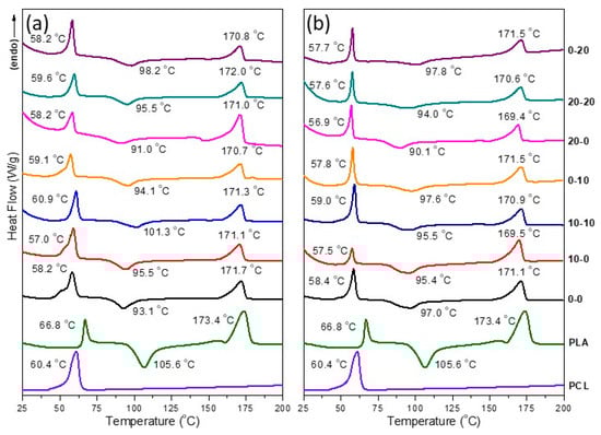Comparing the DSC graphs of filaments (Figure 8a) and printing objects (Figure 8b), the data obtained from the melting point peak show no significant changes. However, it is interesting to note that the cold crystallization temperature (Tc) of PLA is decreasing in PLA/PCL blends (sample 0-0) as well as in the presence of fillers, indicating that both act as nucleators and therefore the nucleation occurs at lower temperatures. The enhancement of the nucleation process in PLA in the presence of PCL has been reported previously [61].