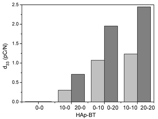 The longitudinal piezoelectric coefficient (d33) was measured for all 3D printed specimens. Figure 9 shows the dependence of the piezoelectric coefficient as a function of HAp/BT composition. It can be seen that both HAp and BT increase the d33 value of the specimens. However, the presence of BT increases the d33 to much higher values than the respective samples containing HAp. All measured values are close to the reported values regarding HAp/BT composite or bone measurements. In particular, Zhang et al. prepared porous composite scaffolds with defined porosity and architecture. The piezoelectric coefficient of the samples HAp30/BT70 and HAp10/BT90 were 1.2 and 2.8 pC/N [62]. In another study, the d33 value of HAp/BT bioceramics was increased to a value of 6.8 pC/N by increasing the BT content to 100% [63]. Other works on 3D printed HAp/BT bioceramics report a maximum value of d33 at 3.08 pC/N. More specifically, piezoelectric properties of 3D printed HAp/BT porous bioceramic scaffolds were determined at different polarization conditions. Composition of scaffolds was 68% wt BT, 18% wt HAp, and 14% wt polyethylenemethacrylate before the sintering process [64].