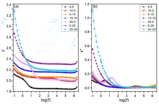 In this study, the combination of the bioactive properties of HAp with a piezoelectric and high permittivity ferroelectric material, such as BT, was attempted. Figure 10 depicts the variation of the real and imaginary parts of dielectric permittivity with frequency at 37 °C, for all the types of the examined systems. The influence of the reinforcing phase becomes evident via the enhancement of (ε′) with filler content. The real part of dielectric permittivity increases with frequency diminishing for constant temperatures. This is expected since epsilon prime reflects the level of the achieved polarization. When the frequency is low, permanent and induced dipoles acquire sufficient time to align themselves parallel to the applied field. Figure 10 denotes that the effect of BT inclusions is more pronounced with respect to the effect of HAp.