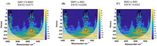 This analysis allowed us to distinguish each spore spectrum as a distinctive feature of each strain. The SBP3 spectrum was more similar to that of BHO (XWTC = 0.8771) (Figure 3B) than to that of BSU (XWTC = 0.8200) (Figure 3A). The affinity observed between the BHO and BSU spectra was slightly higher than that between SBP3 and BSU (XWTC = 0.8262) (Figure 3C).