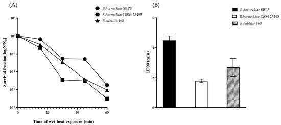 Resistance to wet heat (98 °C) of spores from B. horneckiae SBP3, B. horneckiae DSM 23495 and B. subtilis: (A) survival curves of spores and (B) bar graph displaying the LD90 values (i.e., time to reduce spore survival to 10% of the initial spore culture).