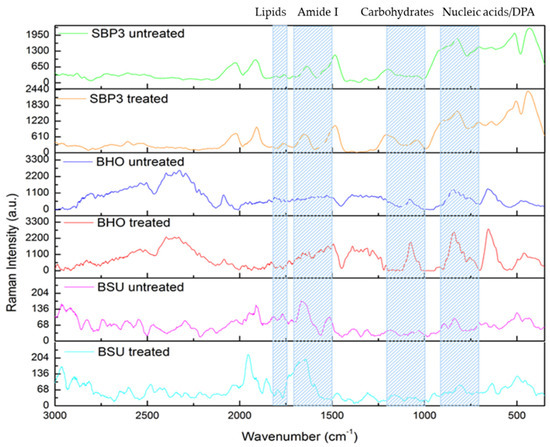 After treatment, changes in the Raman spectra were observed in the region of 800–900 cm−1 attributed to DPA and nucleic acids, with the highest variation detected in BHO and the lowest in SBP3 (Figure 5). Compared to untreated spores, the spectrum of treated BHO spores showed evident peak shifts in the regions that referred to amide I (1660–1674 cm−1) and lipids (1700–1736 cm−1). Unlike untreated SBP3 spores, the spectrum of heated spores showed higher variations in the amide I region, while moderate peak variations were detected in the region attributed to lipids (Figure 5).