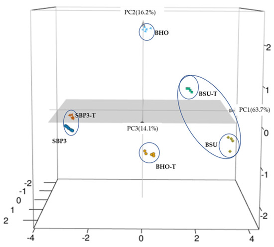 As predicted by the FTIR analysis, the PCA plot (Figure 6) presented a clear distinction among the untreated spores, with SBP3 clustered away from BSU, with the maximum distance in the PC1 axis being related to amide I and α- and β-pleated sheets of secondary proteins, well separated by the PC2 axis (referring to lipids). In the BSU spore spectrum, the peaks observed at 2850 and 2925 cm−1 (Figure 5), related to the CH2 stretching vibrations in the region referring to lipids, indicated the presence of a longer acyl chain and/or saturated fatty acids [26]. These data suggested that the inner membranes of BSU spores are richer in saturated fatty acids than those of SBP3 and BHO. When compared with the other two strains, the lipidic composition of the SBP3 strain (Table 3) displays the highest content of iso-C15 fatty acids (63%) and the lowest content of anteiso-C15 (nearly 9%) fatty acids. The fatty acid content of the SBP3 strain, specifically referring to thermophilic bacilli [3,47], is highly concordant with the high temperature (130 °C) of the vent environment from which it was isolated.