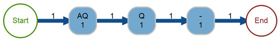 However, as mentioned above, our BPPM model proposes a different perspective on curricular data, where each event in a student’s trajectory is the backpack he or she has at the end of each academic term. Formally, (1) each student identifier in the BPPMt table identifies a different case <b1, b2, … bn>; and (2) a bi event is defined as the record of the group of failed courses that the student must retake at the end of academic period i. For example, for the student identified with s = 23 in Table 2, <AQ, Q, -> represents their backpack trajectory and graphically it can be seen in Figure 3. In his/her first academic period (for example, semester), this student had failed algebra (A) and chemistry (Q) and therefore must retake them. In their second period the student must still retake chemistry (either because the student took it and failed it again or because the student decided not to take the course in the second period) and finally, after the third academic period, the student does not have courses that should be retaken.