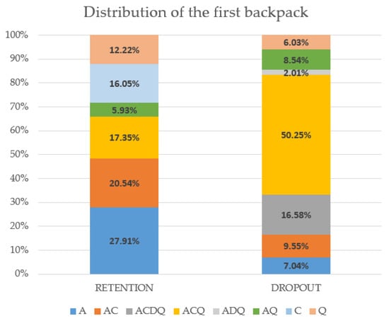 Figure 4 shows that the first backpack of students who remain in their undergraduate programs are more evenly distributed, compared to the first backpack of students who dropped out, where close to half (50.25% of cases) began with backpack ACQ. An institution seeking to reduce the early dropout risk could use this information, for example, to implement support mechanisms for students who have failed certain courses simultaneously or change the design of its curricula to prevent certain combinations of failed courses from occurring at high frequencies.