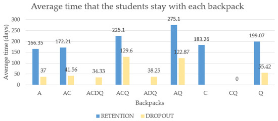 When the average time that the students stay with each backpack is compared, it is possible to see that the average time that the dropout students stay with each backpack is less than the average time for students who remain. Figure 5 shows that the average time that students who ended in RETENTION stay with each backpack, varies from 166.35 to 275.1 days. In contrast, Figure 5 also shows that the average time that students who ended in DROPOUT stay with each backpack, varies from 0 to 129.6 days. In particular, those backpacks with an average duration of much less than one semester (A, AC, ACDQ, ADQ, CQ, Q), show that a significant proportion of students who fall into this situation dropout without even retaking such courses or attempting to pass them.