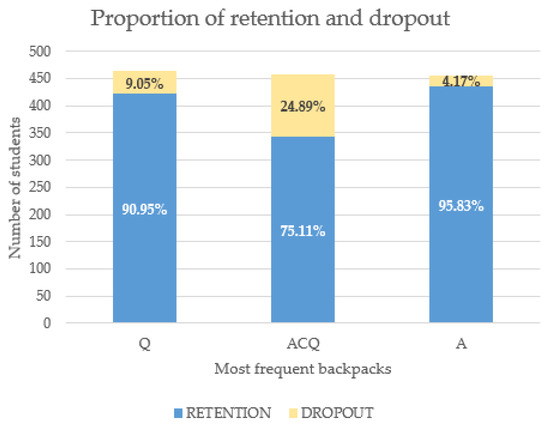The BPPM model also allows us to compare the backpack trajectories that include specific backpacks. For the three most frequent backpacks: Q (464 cases), ACQ (458 cases) and A (456 cases), Figure 6 shows the proportion of educational trajectories, according to the BPPM model, that ended either in RETENTION or in DROPOUT. While there are differences in the proportion of students who dropped out for each backpack, in all cases the majority of students remained. Following, a more fine-grained analysis is presented, to illustrate the differences in the educational trajectories that include each backpack.