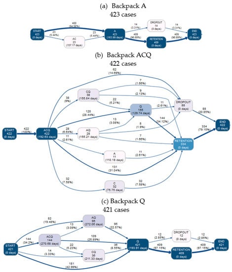 Figure 7 shows the 90% most frequent variants of the students who had backpack A, ACQ and Q. Figure 7a shows that the vast majority (94.56%) of the students had backpack A as the first and the only backpack in their trajectories.