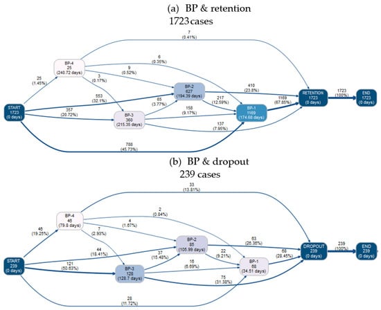 To easily distinguish between cases that ended in dropout or retention, for the backpack trajectories that ended with the empty backpack, in the BPPM model, the “-” label was replaced by the label “RETENTION” and in the other cases, a “DROPOUT” event was added at the end of the case. In the example used in the previous paragraph, <AQ, A, ->, was replaced by <AQ, A, RETENTION> in the BPPM event log.
