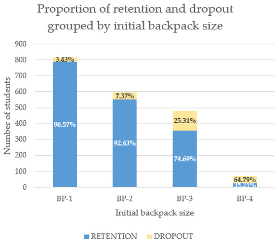 Number and proportion of students who, according to the BPPM-S model, either finished in RETENTION or in DROPOUT, grouped according to the initial backpack size.