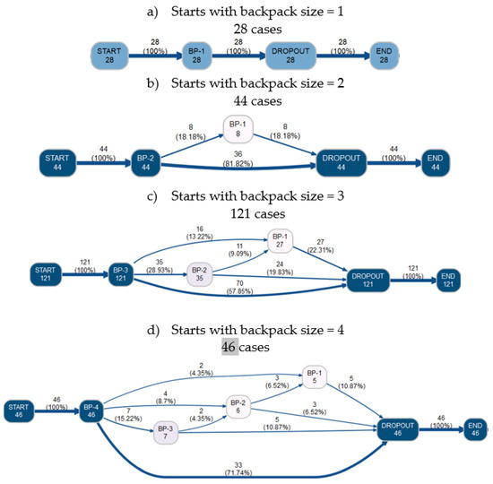 Figure 8b shows that most backpack trajectories for dropout students start with a larger backpack size. Moreover, for backpack sizes larger than 1, there are mainly direct transitions from the nodes to dropout.