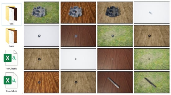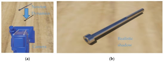 In the previous research [] there was combined Blender 3D software with Python scripting language for an automated generation of the CNN training set, but the Blender rendering engine does not provide cinematic quality of the generated samples. This disadvantage significantly decreases the classification precision of trained convolutional networks by about 20 to 30%. The new approach is based on cinematic rendering from the Unreal Engine combined with Blueprint and Python scripting language. The next new feature is a dynamic collision used for realistic shadow rendering placed under generated samples on a different surface. An example of part position in the 3D inside of Unreal Engine editor setup before dynamic simulation (left) and the part with shadow after simulation (right) is shown in Figure 6.