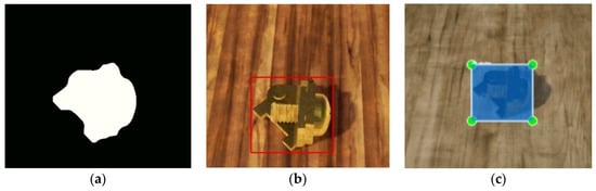 An autogeneration of the part localization by OpenCV for Segmentation: (a) the input image with black background from the Unreal Engine; (b) the result of OpenCV algorithm for precise contour generation; (c) an example of manual contour selection in VGG Image Annotator.