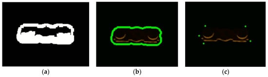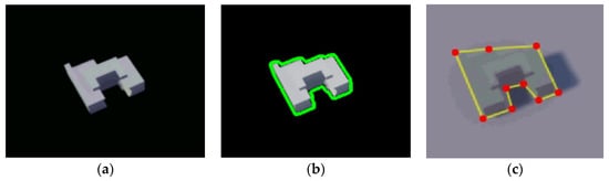 OpenCV detected contour representation: (a) binarized image; (b) all detected points; (c) reduced number of points optimized by Douglas-Peucker algorithm.