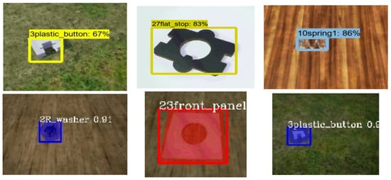 CNN models with single shot detection can be retrained very fast by transfer learning with accepted results within less than 2 h of training without dedicated GPU (for example the used pretrained Faster RCNN Inception V2 SSD reached the required accuracy within 1.35 h). CNN models with segmentation for the same input samples need 4–5 times more time for successful training (for example the used pretrained Mask RCNN Resnet101 reached required accuracy up to 5.20 h). But in contrast to SSD where a model is saved after unpredictable numbers of iteration, the training of models with Segmentation is stored after each epoch. The results of recognition of other images (not training set) of some parts for both tested CNN models (SSD and instance segmentation) are shown in Figure 14.