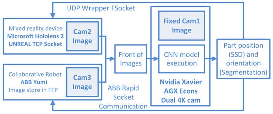 The collaborative work cell contains a SMART vision system consisting of three cameras. The primary camera is connected to NVIDIA Xavier AGX (Figure 15a), where is uploaded trained CNN model. The second camera is integrated into mixed reality devices (Figure 15b) and the third camera is integrated into the right hand of the collaborative robot (Figure 15c). The principle of parts detection can be described in these steps: