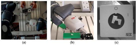 SMART vision system of the collaborative work cell: (a) CNN processing unit NVIDIA Xavier AGX; (b) Mixed reality device camera; (c) Collaborative robot ABB Yumi Vision system integrated into the right hand.