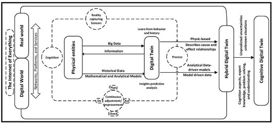 The concepts of the Hybrid and Cognitive Digital Twin (COGNITWIN) toolbox were developed by Abburu et al. [6] to cover cognitive skills for efficient management and operation of processing equipment, for lowering production costs, and efficiency improvements in the process industry. A sensor network can constantly track and capture data from different plant processes and properties stored in a standard setup database. The COGNITWIN project mainly aims at adding the cognitive component to process control systems, thus enabling them to self-organize and provide solutions in case of unexpected behaviors. Figure 2 shows the different stages of DT to CDT. A DT is a formal digital representation of an asset, process, or system that captures any systems’ attributes and behaviors through IoT-based various reality capturing sensors suitable for communication, storage, interpolation, and processing to measure, simulate, and experiment with the digital replica to understand its physical counterpart. A DT for monitoring, diagnostics, and prognostics to optimize asset performance and utilization uses sensory data combined with historical data, human expertise, and fleet and simulation learning to improve prognostic outcomes. A DT gets data from physical entities and applies them to the model.
