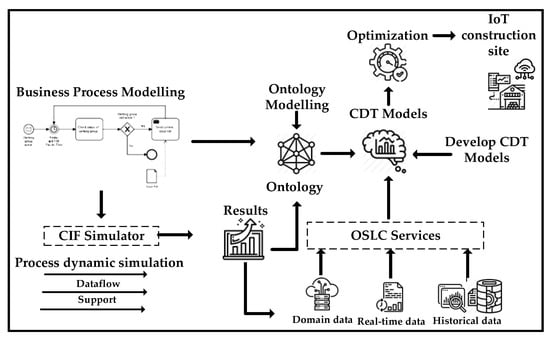 The definition, which is data-oriented, resides at the heart of the CDT. Construction 4.0 needs a greater cognitive increase in assets to allow continuous improvement of the data-driven process. CDTsBLM uses a modern architecture for generation construction data analytics to integrate cognition into DTs and as a meta-platform to help create and implement a range of building applications, such as quality management and predictive maintenance. The CDTsBLM approach depends on a new DT data analytics, in which an innovative CDT-driven metaphor represents a system model, improving the DT base and the integrated CDT structures to understand and solve situations that cannot be modeled, for example, by design allowed in numerical models or experience in the context of numeric models. Based on the current process data in real-time, this integrated approach will explain the issue, including tool deterioration for each particular machine and product type. This cognitive function is assisted in rare cases by the just-in-time process status simulation to measure an anomaly’s assurance that needs to be resolved in an extraordinary circumstance. This data-driven simulation would also indicate whether an anomaly is triggered by a particular scenario, meaning how long current process settings will remain unchanged. This novel approach describes data-driven model simulations from twins using novel predictive clustering methods and advanced inductive database mining rules.