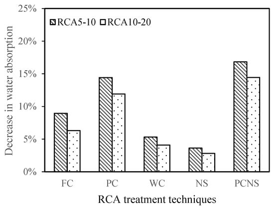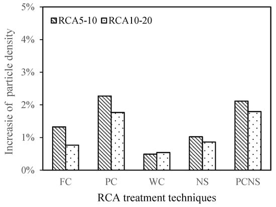 Compared with that of the original RCA, the percentage of the decrease in water absorption of RCA and the increase in particle density of RCA after using different treatment techniques are shown in Figure 1 and Figure 2, respectively. In the figures, FC, PC, WC, NS and PCNS represent flow-through carbonation, pressurized carbonation, wet carbonation, NS pre-spraying, and the combined pressurized carbonation with NS pre-spraying, respectively. It can be observed that the decrease in water absorption of the smaller size aggregate (RCA5–10) was larger than that the larger aggregate (RCA10–20). Among the three types of carbonation techniques, pressurized carbonation caused the largest reduction (14.4% for RCA5–10 and 11.9% for RCA10–20) in the water absorption value, followed by flow-through carbonation, and the last one was wet carbonation. After using the NS pre-spraying technique, the water absorption of RCA was only slightly decreased (3.6% for RCA5–10 and 2.8% for RCA10–20) which was even less than that of the wet carbonation. When using the combined pressurized carbonation with NS pre-spraying method, the water absorption exhibited the highest decrease (16.8% for RCA5–10 and 14.4% for RCA10–20) suggesting that these two methods can work effectively to enhance RCA. Generally, the increasing trend of the particle density corresponded to the decreasing trend of water absorption after the RCA was subjected to the different treatment methods. However, the magnitude of the increase in the particle density was much lower than that of the decrease in water absorption.
