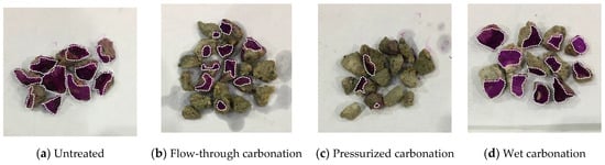 The images of the un-treated RCA and RCAs treated by three types of carbonation methods after spraying phenolphthalein solution are shown in Figure 3. A pink color (within dotted line in Figure 3) represents that the area was not carbonated. Some of untreated RCA was shown to have been carbonated on the surface because it was placed in air for a long time. However, the interior of the RCA was not carbonated. After using the pressurized carbonation technique, most of the interior of the RCA was carbonated. When using the flow-through carbonation, the carbonation degree was lower than using the pressurized carbonation. The carbonation depth of RCA was very small after subjecting to the wet carbonation. The results indicate that the water absorption and particle density of RCA are dependent on the carbonation degree of RCA.