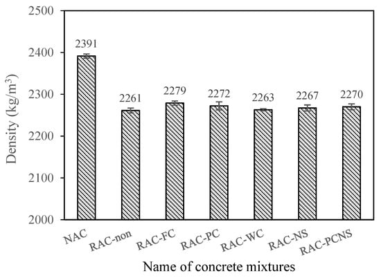 The densities of the seven groups of new concrete prepared are shown in Figure 4. The results showed that the density of NAC was 5.8% higher than that of RAC prepared with the untreated RCA. That is because the density of NCA was higher than that of RCA. After using the treatments methods, the density of RAC was slightly increased. However, the magnitudes of the increase were very small (<1.0%).