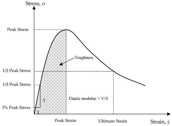 An example of stress–strain curve of concrete is shown in Figure 5. The peak stress is the maximum stress of the stress–strain curve. The peak strain is defined as the strain corresponding to the peak stress. The ultimate strain is defined as the strain corresponding to the stress at which 50% of the peak strain at the descending part of stress–strain curve is attained []. Toughness is an index to represent the energy absorption capacity of a material, which is often defined as the area under the stress–strain curve. In this study, toughness of the concrete is determined as the area under the stress–strain curve up to the peak stress of the concrete specimens []. The elastic modulus () is determined from the stress–strain curve using the following equation
