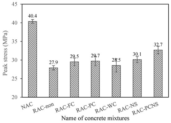 The peak stresses of seven groups of concrete after subjecting to the compressive load test are shown in Figure 6. The peak stress of NAC was 44.7% higher than that of RAC-non. After using the RCA treatment techniques, the peak stresses of the RAC were increased. The increment by using the pressurized carbonation was higher than that of flow-through carbonation and wet carbonation. That is because when using the pressurized carbonation, the carbonation degree of RCA was higher than using other two carbonation techniques, leading to a better enhancement of RCA. The NS pre-spraying technique caused a slightly better improvement in peak stress than using the three types of carbonation techniques. That is because the ITZ between RCA and new mortar was enhanced after using NS pre-spraying, which may be more efficient to improve peak stress than the enhancement of RCA. When using the combined pressurized carbonation with NS pre-spraying technique, the peak stress exhibited the highest increase (17.1%) than the RAC-non because both the new ITZ and the RCA were enhanced. However, it was still significantly lower than that of NAC.