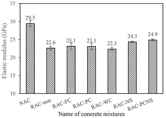 The elastic modulus values of the studied concrete are shown in Figure 7. The elastic modulus of NAC was 30.3% higher than that of RAC-non. However, the elastic modulus of RAC was increased after using the treatment techniques. After using the three carbonation techniques, the increases were less than 3%. The NS pre-spraying technique induced a larger increase (7.6%). It indicates that the enhancement of the new ITZ might be more efficient in improving the elastic modulus of RAC than the enhancement of RCA. After using the combined pressurized carbonation and NS pre-spraying, the elastic modulus exhibited the highest increase (10.0%). However, the magnitude of increase in elastic modulus of RAC was much lower than that of the compressive strength, indicating that the influence of the carbonation treatments and NS pre-spraying treatments on elastic modulus of RAC was less obvious than that on compressive strength.