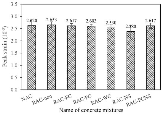 The peak strains of the studied concrete are shown in Figure 8. It showed that the peak strain of NAC was slightly lower (1.2%) than that of RAC, and it did not show significantly changes after using the RCA treatment techniques although some variations were observed.