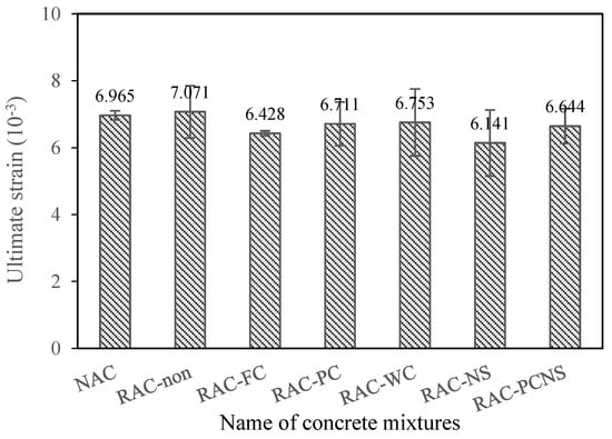 The ultimate strain values of all the concrete specimens are shown in Figure 9. Similar to the peak strain, the ultimate strain of NAC was slightly lower (1.5%) than that of RAC-non. Meanwhile, after using these RCA treatment techniques, the ultimate strain of RAC were all reduced.