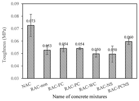 The toughness values of all concrete specimens are shown in Figure 10. It shows that the toughness of NAC was 37.8% higher than that of RAC-non. After using the flow-through carbonation and pressurized carbonation, the toughness of RAC increased slightly (2.7% and 2.6%, respectively) because of the increased peak stress and elastic modulus. However, the toughness of RAC decreased slightly (5.7% and 5.6%, respectively) when using the wet carbonation and NS pre-spraying techniques. It may be related to the decreased peak strain. After using the combined pressurized carbonation with NS pre-spraying technique, the toughness of RAC showed much a larger increase, which was 13.1%.