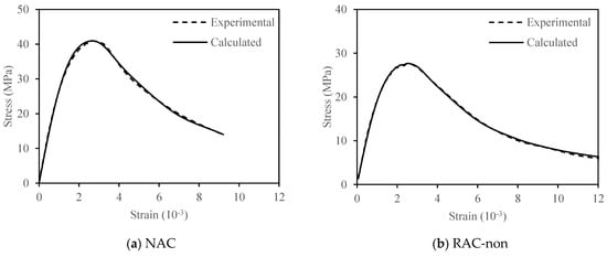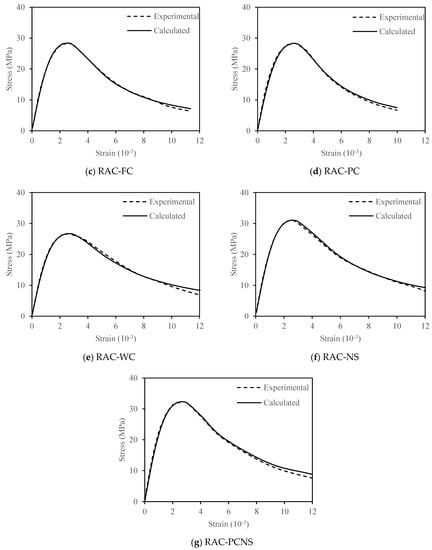 For each type of concrete, a typical experimental stress–strain curve was compared with the calculated one based on the above equations, as shown in Figure 11. It was observed that the experimental stress–strain curves of all concrete specimens matched well the calculated stress–strain curves. Therefore, it is suggested that the uni-axial compressive stress–strain curve of concrete given in the Chinese code (GB50010-2010) are also suitable to the RACs with untreated RCA and treated RCA by using the studied RCA treatment techniques.