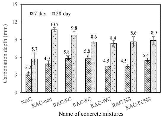 The carbonation depth of concrete is an indicator to assess its carbonation resistance. A lower carbonation depth means better carbonation resistance. The 7-day and 28-day carbonation depths of the seven groups of concrete are shown in Figure 12. The 7-day and 28-day carbonation depths of RAC-non were much higher than that of NAC. After using the flow-through carbonation, pressurized carbonation and combined pressurized carbonation with NS pre-spraying, the 7-day carbonation depths of the corresponding RACs were even larger than that of RAC-non. However, the 28-day carbonation depths of these RACs were lower than that of RAC-non. That is because the carbonated RCAs influenced the carbonation depth of RAC in two ways. On one hand, the carbonated RCA was more densified than that of non-treated RCA, which reduced the penetration rate of CO2 and thus caused a reduction of carbonation depth. On the other hand, the carbonated RCA itself influenced the measurement of average carbonation depth, leading to an increase in carbonation depth of RAC. When the carbonation depth of RAC was small, the influence of carbonated RCA on the measurement carbonation depth was more significant. On the contrary, the influence of the carbonated RCA on the CO2 penetration rate played a more important role when the carbonation depth became larger. It could be anticipated that when the carbonation resistant test duration was longer, the adverse effect of the carbonated RCA could be reduced.