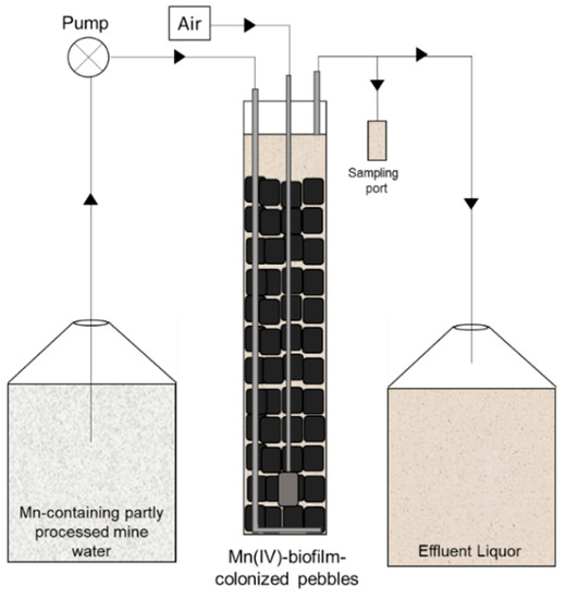 Removal of soluble Mn (II) present in partly processed synthetic mine water was effectively removed in column bioreactors packed with pebbles coated with Mn (IV) biofilms by a combination of chemical adsorption and microbial oxidation. The Mn (II)-oxidizing microflora were predominantly heterotrophic, and provision of small amounts of additional organic substrates appeared to be required to sustain their activities and to effectively remove manganese. Under optimized conditions, >99% of Mn removal was obtained, lowering concentrations of soluble Mn to below regulatory discharge levels. Microbiological remediation greatly reduced the requirement for large amounts of alkali addition associated with chemical mitigation of Mn-rich waters. Future work should consider the effect of both continuous input of organic carbon and fluid shear stress on biofilm growth and manganese removal. At least two species of Mn-oxidizing microorganisms were identified—the bacterium L. discophora and a novel fungus that was isolated and characterized in vitro.