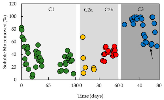 Variations in the percentage of manganese removed during the time course of the experiment. Key: phase C1 (green): 1-column system pH 5.0, HRT 12 h; C2a (yellow): 1-column system pH 6.5, HRT 12 h; C2b (red) 1-column system pH 6.5, HRT 24 h and C3 (blue): 2-column system pH 6.5, HRT 45 h. The arrow indicates where yeast extract (final concentration 100 mg L−1) was added to the influent liquor.