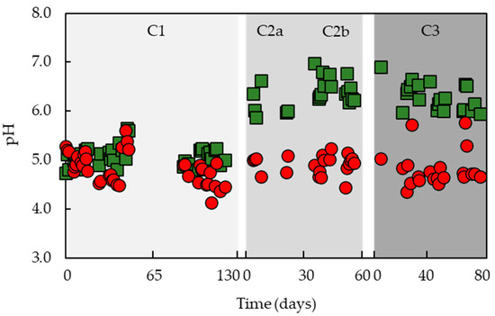Differences in pH in the feed liquor (■) and effluent liquor (●) of the MnOBs. Phases C1 and C2a,b, 1-column system; phase C3: in-line 2-column system. The pH values of the effluent in phase C3 are those of liquors draining the second in-line column.