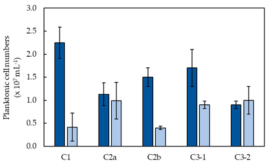 Cell numbers in the feed liquor (dark blue) and effluent liquor (light blue) of the MnOBs. Phases C1 and C2a,b, 1-column system; C3-1 represents column 1 and C3-2 represents column 2 of the in-line 2-column system. The bars depict mean values and the error bars standard deviations (n = 20).