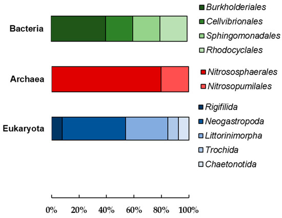 Relative abundance of microbial taxonomy (order) of the clones obtained from Mn (IV) biofilm-colonized pebbles collected from a stream in Snowdonia, UK, based on archaeal and bacterial 16S and eukaryote 18S rRNA genes.