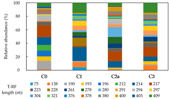 Terminal restriction enzyme fragment length polymorphism (T-RFLP) analysis (HaeIII digests) of amplified 16S rRNA bacterial genes from the biofilm-colonized pebbles collected from the stream (C0) and at different phases (C1, C2a and C3) of operating MnOBs. The T-RFs are stacked upwards in each column in increasing fragment lengths.