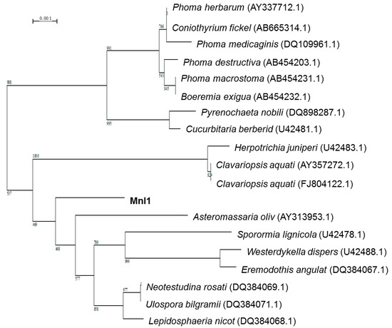 Phylogenetic analysis revealed that isolate MnI1 belongs to the Ascomycota phylum and clusters with members of the order Pleosporales, class Dothideomycetes. The 18S rRNA genes sequence from MnI1 was closely related (98% gene similarity) to those from Ulospora bilgramii and several other species. The phylogenetic tree (Figure 8) showed MnI1 as a single member of a clade forming a branch with low bootstrap values of 47%, supporting the monophily of the clade. Based on these findings, it appears that this fungal species has not been previously described.