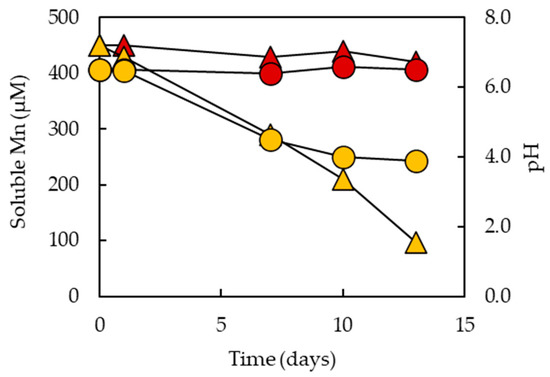 Changes in soluble manganese concentrations (▲, ▲) and pH (●, ●) in shake flasks cultures inoculated with isolate MnI1 (▲, ●) and noninoculated controls (▲, ●) with isolate MnI1. The experiment was carried out in duplicate and different values between replicates are occluded by the symbols.
